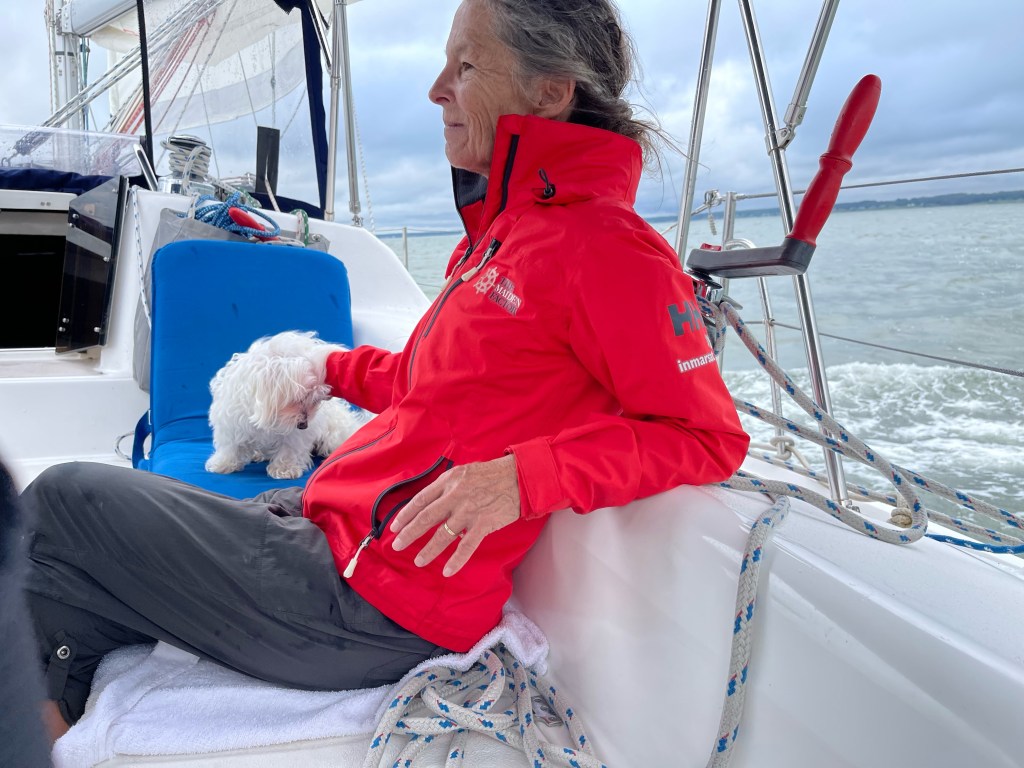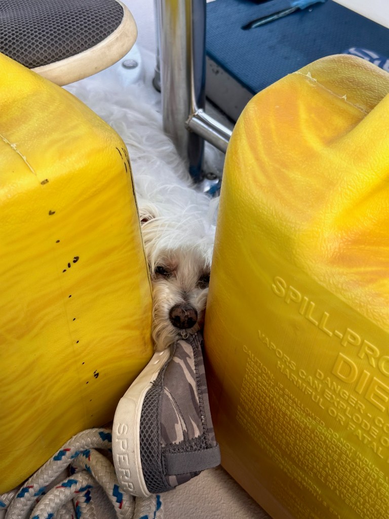 When we turned out of the mouth of the Rappahannock and turned north things got sporty in a hurry. The wind was just a little west of north and straight down the bay so we were now beating to weather in short period slop. You would have thought we’d have learned by now not to fight the wind, obviously not. It wasn’t as bad as when we left Mobjack but Nancy was queasy, but she probably had Covid. In addition to the destruction down below from heeling poor Mitzi got very sick all over, everywhere.