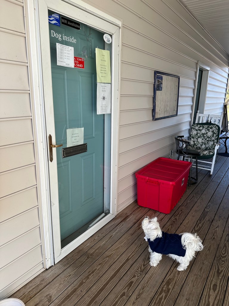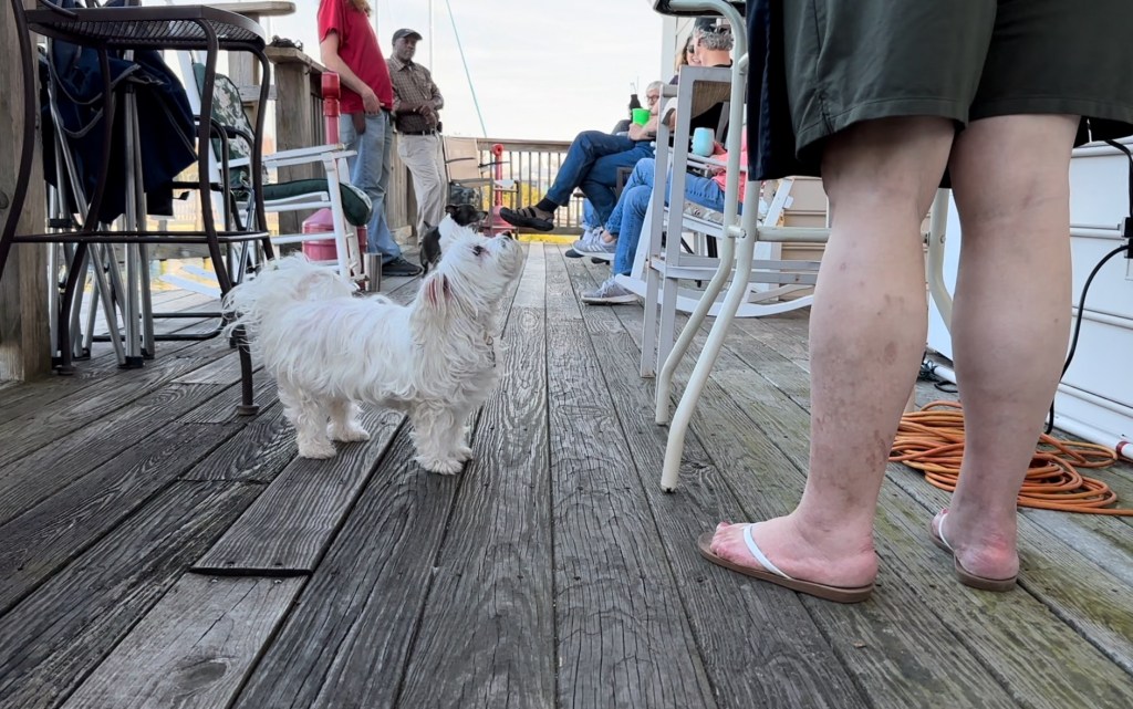 Mitzi demanding treats from the dock master at Urbanna even though they are not open yet