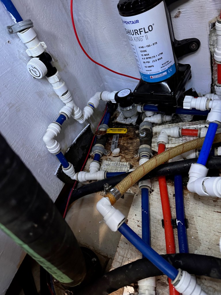 Next on the agenda was installing a new water heater. The old one had stopped working and was removed in the fall. And like any boat project we became distracted and decided to work on a few other things while the heater was out and there was room. Like painting inside of the cabinet where much of the plumbing is and checking many of the boats PEX connections for leaks. Putting in the new heater just meant removing door frames, taking out shelves , dropping the new heater in, reconnecting everything, topping off antifreeze for the engine since it goes through the heater and some was lost, and finally reassembling everything. A good days work but we felt accomplished.