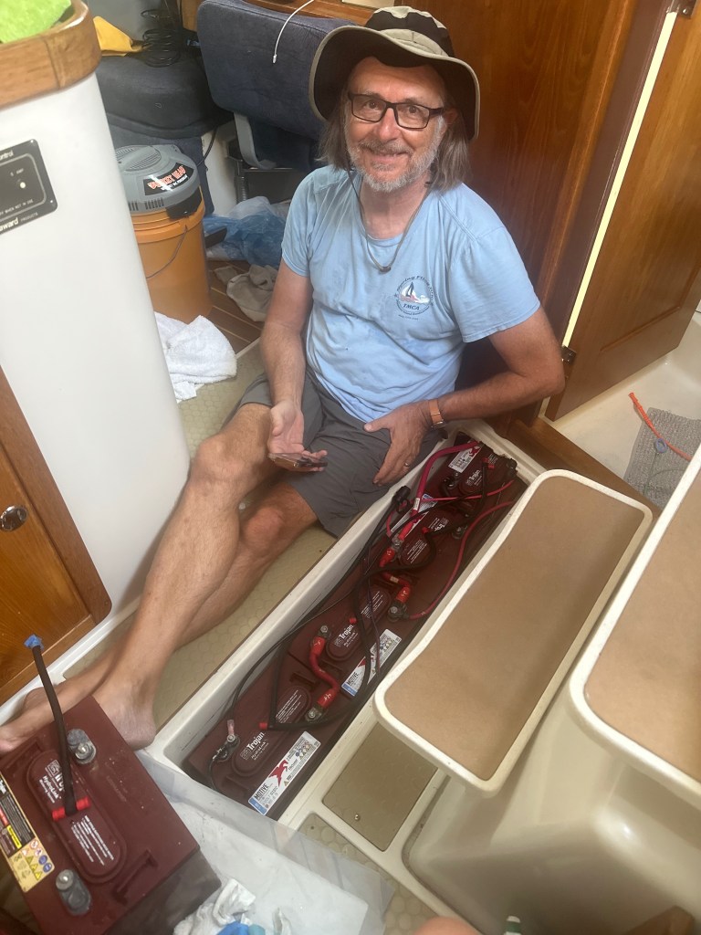 Also the alternating current inverter batteries had died so we had to get new batteries. This meant moving the old DC batteries to the AC battery spot and putting the new batteries in the house bank (DC) spot