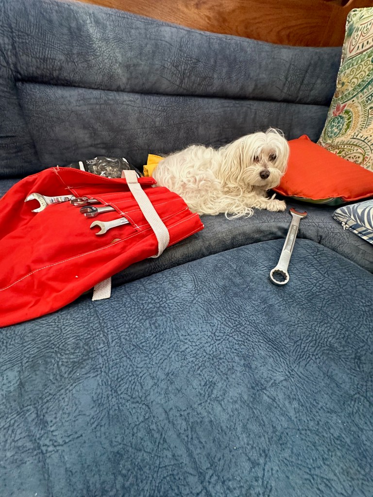 Before we left a diesel smell had to be addressed. It turns out that the crush washers on the injectors had vibrated loose and needed to be retightened. This was above our pay grade so we hired a mechanic to help. Also we discovered that the fuel tank was leaking around the screws that hold the inspection port cover in place. We had inspected the fuel a few months back and had not put teflon tape around the threads when resealing, oops.