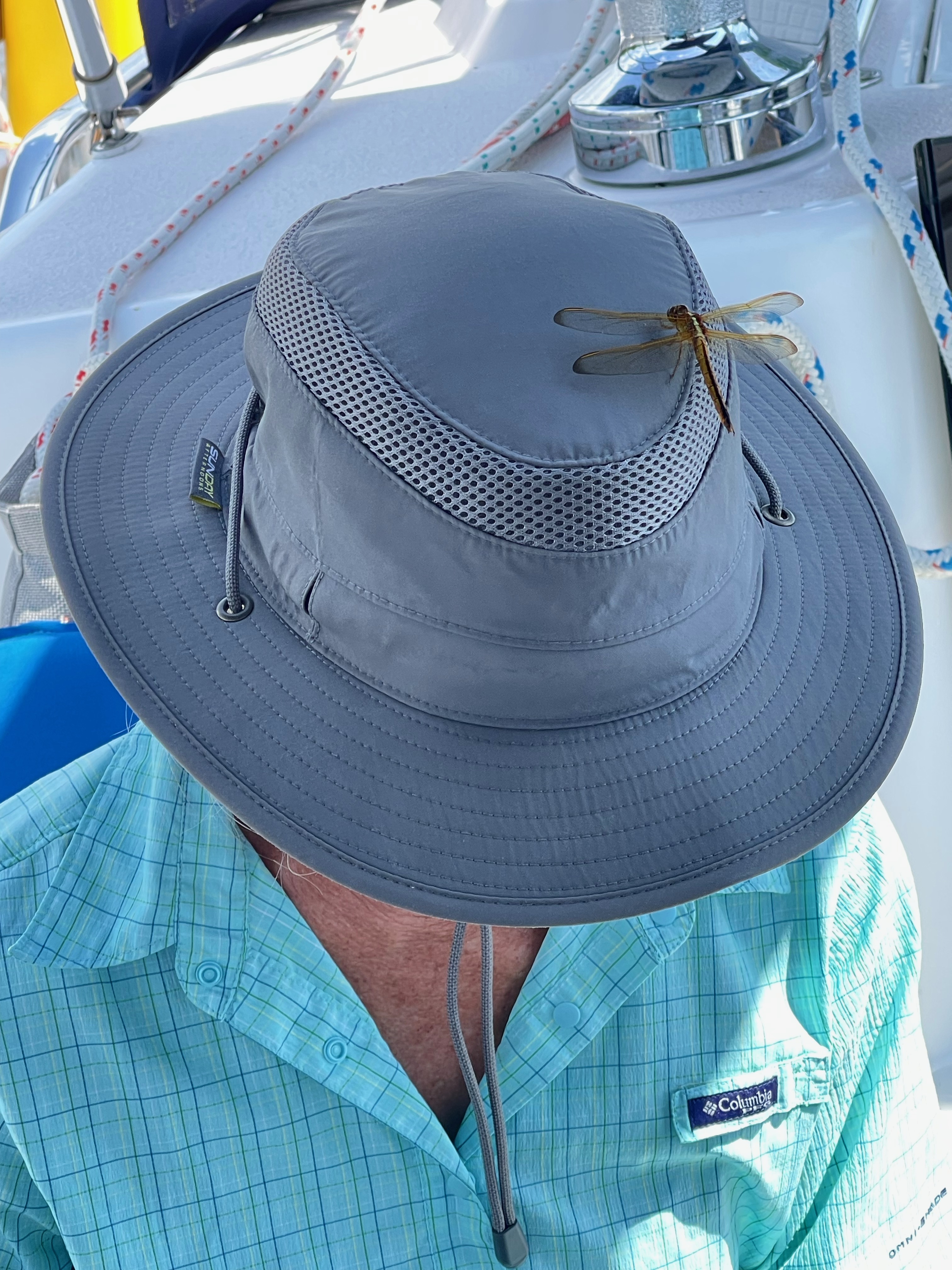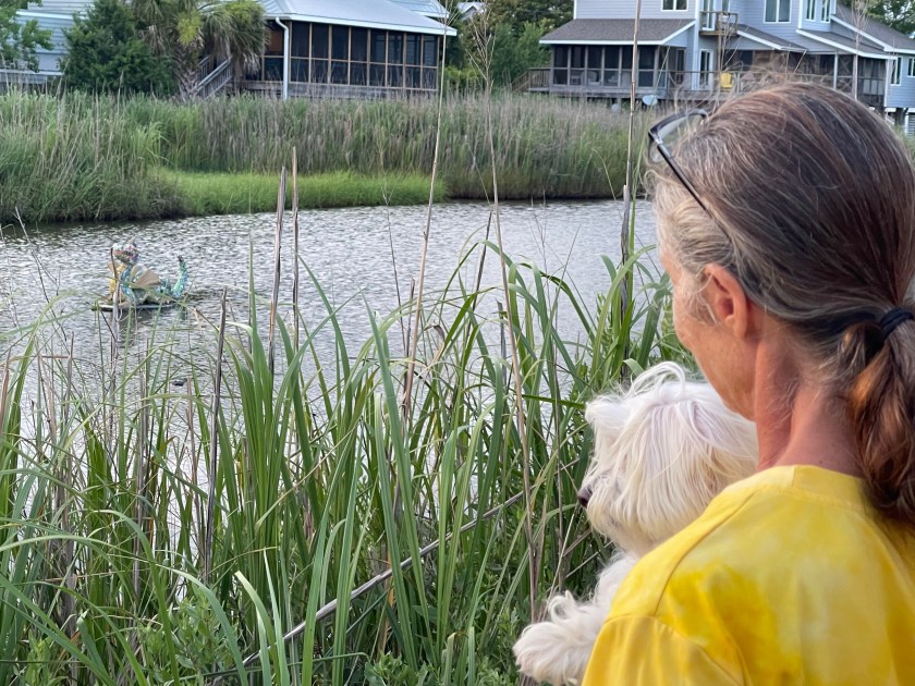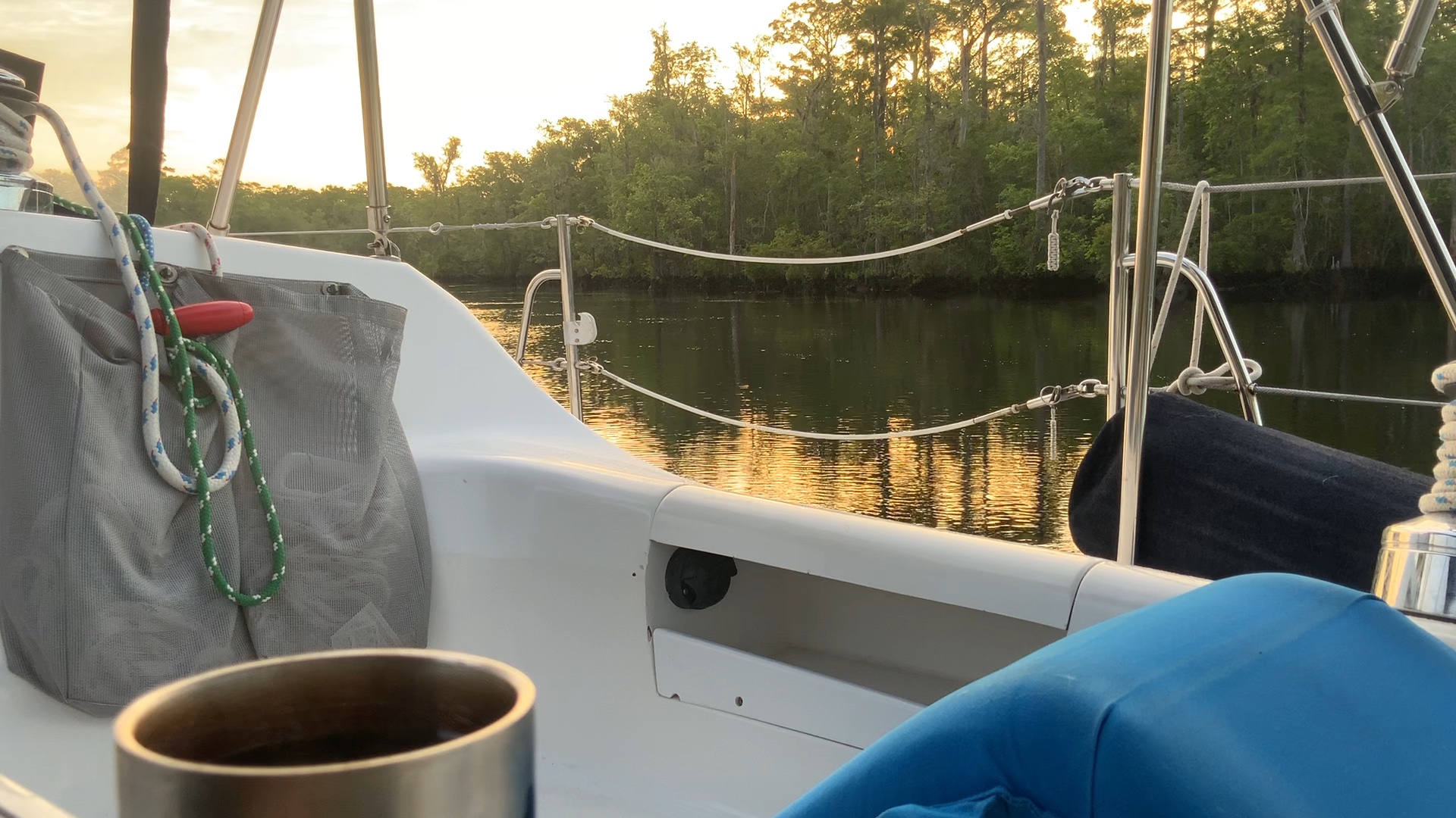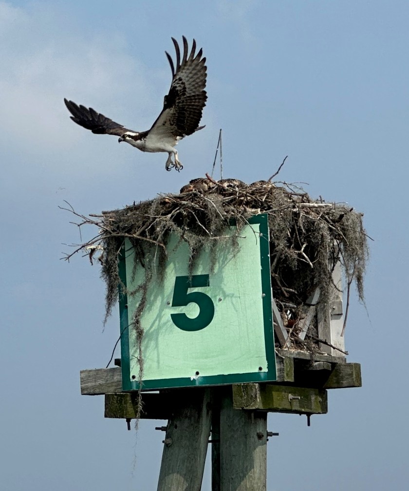 As Mischief approached Hampton Roads her sails finally came out to see the wind and sun again. Boats have personalities and Mischief let us know she was happy to be sailing again without the engine on. Without even being trimmed perfectly she sped along at 7-8 knots. Now and then faster. All we did was sit back and enjoy. John mused, “Why can’t she sail like this when we’re in a race?” At that speed ground was covered quickly. We entered the Chisman Creek Inlet and went up the Poquoson River to anchor. The anchorage of course was beautiful, most of them are. Across the river from us was a Bald Eagles nest. They are such majestic birds and treat to see.
